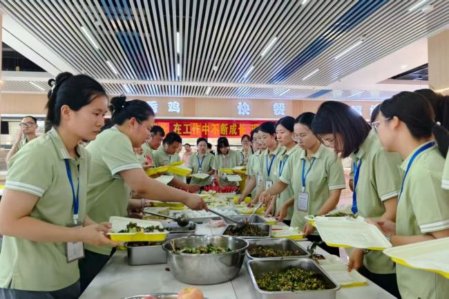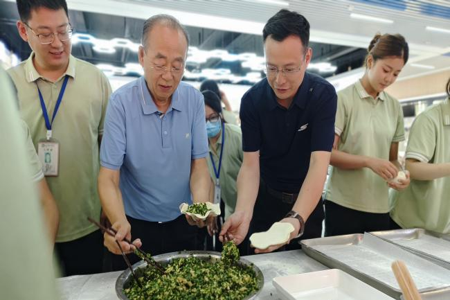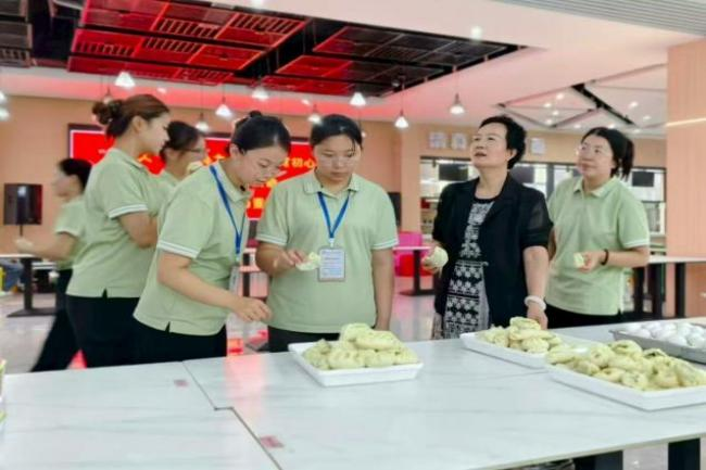 朱松涛校长亲临包包子环节,参与取面、擀皮、放馅、捏褶,动作娴熟,还与教职工交流手法、点评作品,带动现场氛围升温,案板很快摆满饱满包子。活动尾声,大家围坐共享成果,热乎包子、精致热菜搭配餐厅准备的桃子、西瓜,尽显“自制盛宴”香甜。