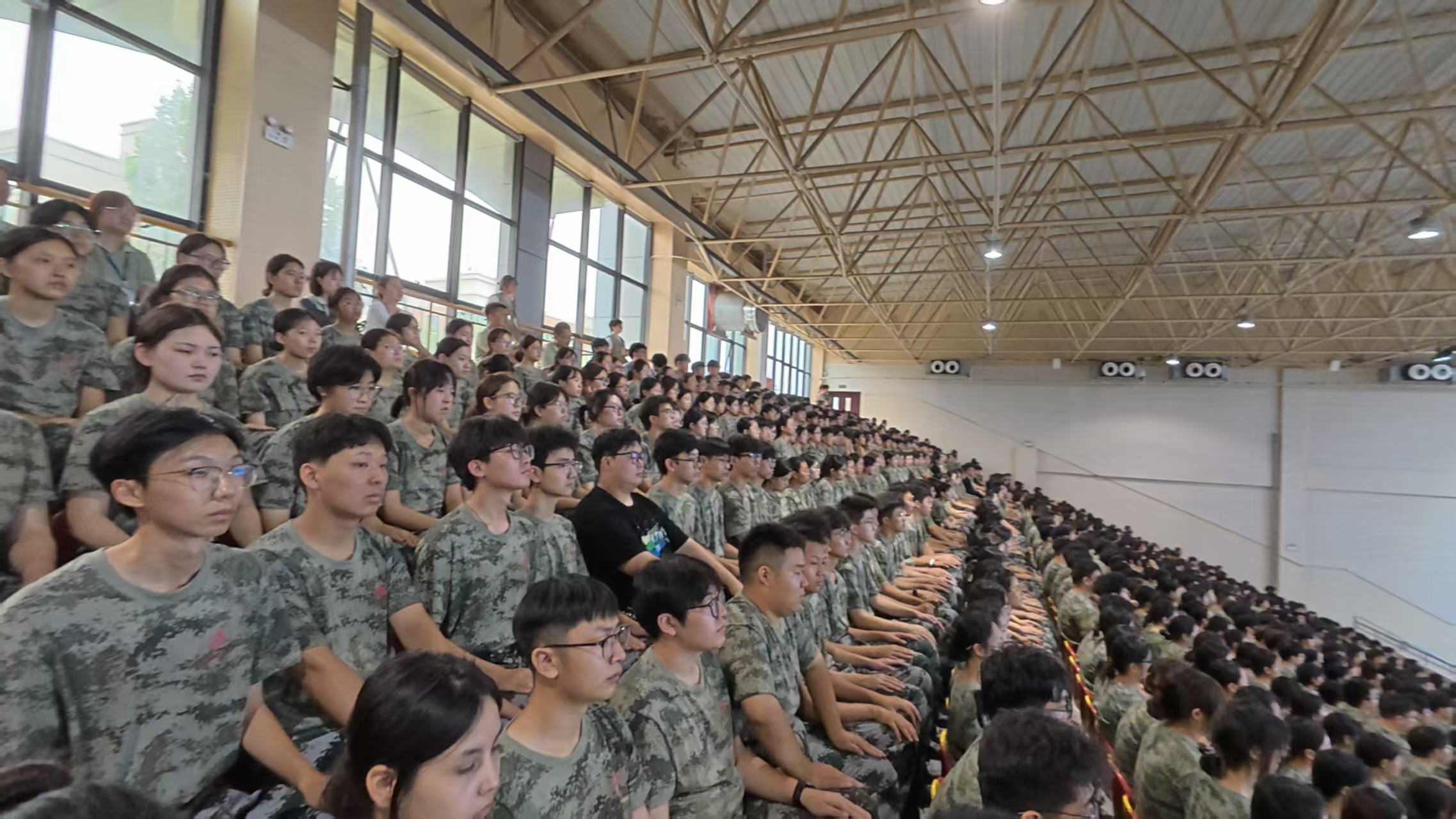 上午9时,体育场和教室坐满师生。医学院大一新生们精神饱满,等待仪式开始。国歌奏响,五星红旗升起,全体肃立高唱,眼中饱含着对祖国的深情与作为未来医护人员的坚定。