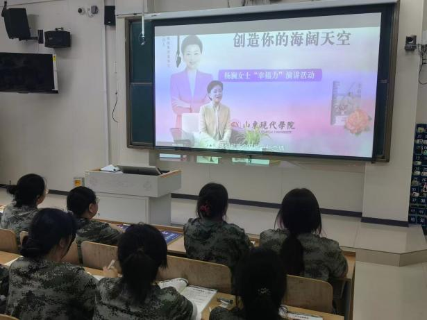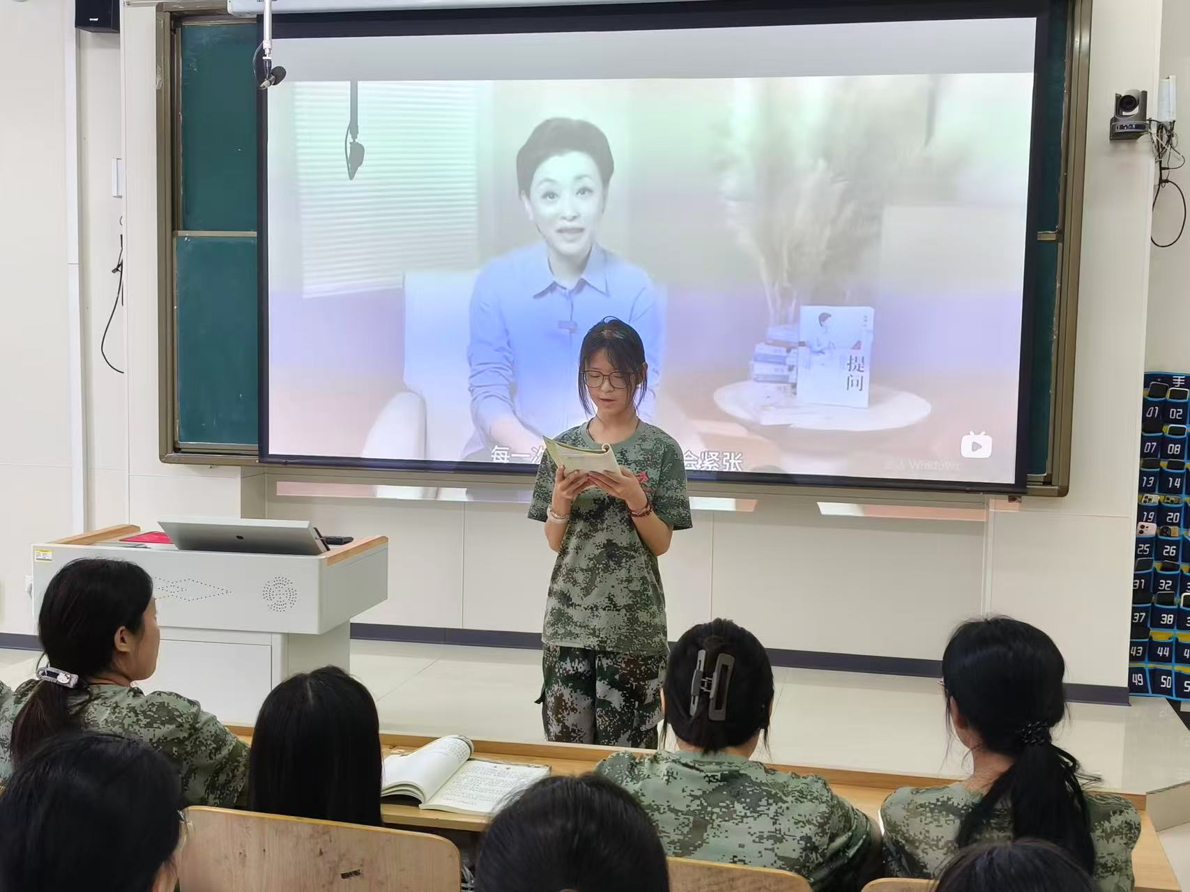 成长分享与视频学习,明晰发展方向:国学诵读后,新生代表结合自身感悟发言,分享对经典文化与成长责任的理解;随后师生共同观看知名媒体人杨澜关于“幸福力”主题的采访视频。观看结束后,新生们纷纷表示将汲取成长智慧,以积极心态投入军训与大学生活。
