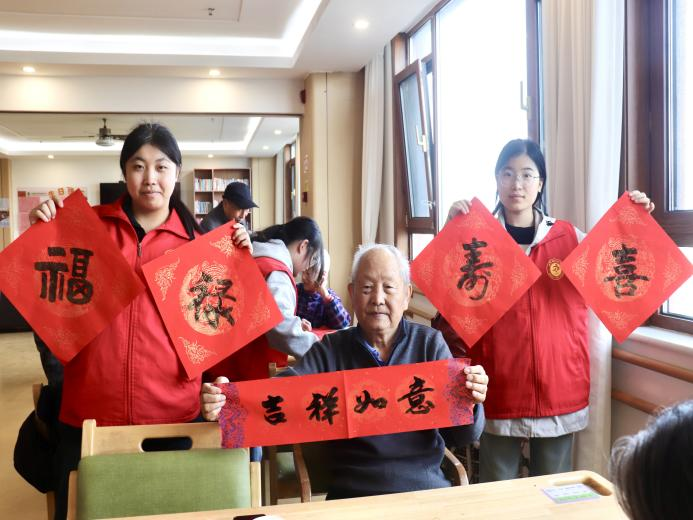 随后,一场充满墨香的文化互动拉开帷幕。志愿者铺开宣纸、细细研墨,陪伴老人书写“福”字与对联。苍劲的笔触寄托着对安康晚年的美好祝愿,老人们也兴致勃勃地提笔挥毫,现场墨香氤氲,笑语不断。