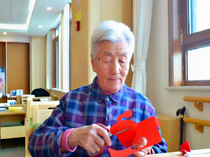 在剪纸环节,志愿者拿出红纸与刻刀,耐心指导老人们剪制“寿桃”“喜鹊”等吉祥纹样。折纸、剪裁、雕刻间,老人指尖灵动,一幅幅作品被小心收好,成为珍贵的纪念。