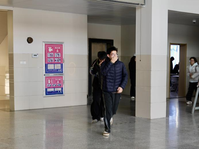 演习启动后,德润楼内火警骤响,烟雾模拟系统同步启动。引导员迅速到位维持秩序,师生们用湿毛巾捂住口鼻、弯腰沿预定路线有序疏散至北广场。各班清点人数无误后向总指挥汇报,整个过程紧张有序、衔接顺畅,圆满完成既定目标。