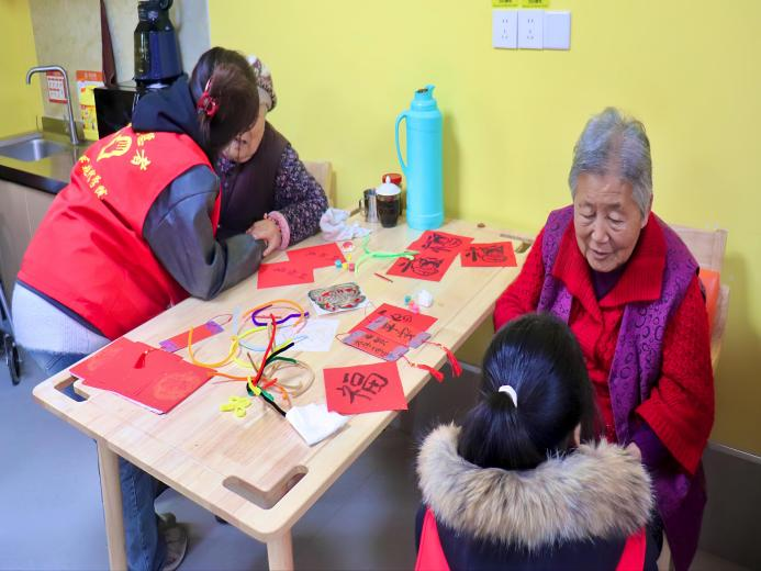 活动中,志愿者为老人们精心准备了多样手工体验:在扭扭棒制作环节,老人们在协助下,完成花束与小动物作品;书法创作中,他们挥毫写下“福”“寿”等字样,尽显笔墨风采;拓印画活动中,志愿者借助模板帮助老人印出花鸟、福纹图案;剪纸环节,老人们手持剪刀,巧手剪出窗花与生肖样式,传承非遗之美。