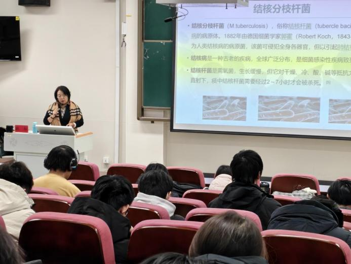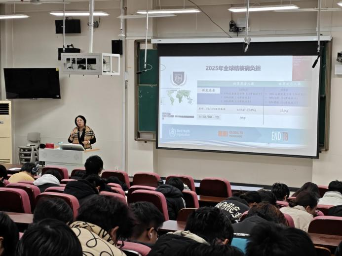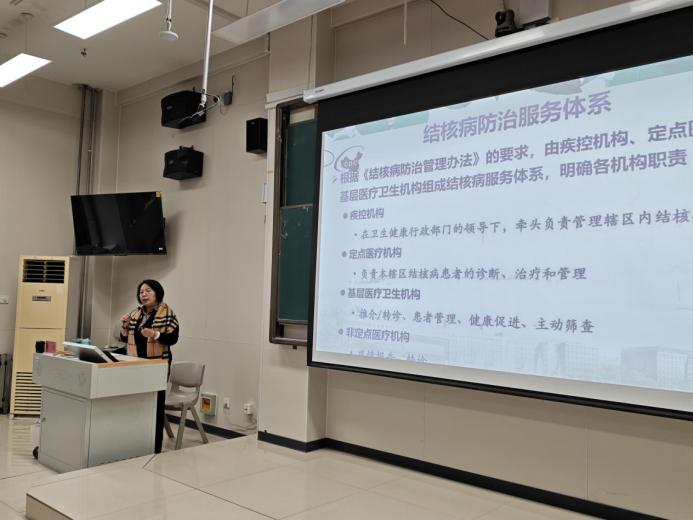 围绕世界卫生组织“终止结核病流行”战略目标,耿教授详细解读了“防、诊、治、管、教”五位一体的全流程防控体系。她特别提醒学生注意三点:一是主动参与筛查,尤其是密切接触者应接受医学观察;二是加强个人防护,保持宿舍通风,咳嗽打喷嚏时遮掩口鼻;三是规范就医报告,发现症状及时就诊,杜绝隐瞒病情。同时,她介绍了我国结核病防治服务体系的三级架构——疾控机构统筹管理、定点医疗机构负责诊疗、基层医疗卫生机构落实随访与健康促进,帮助同学们深入了解防控网络运行机制。