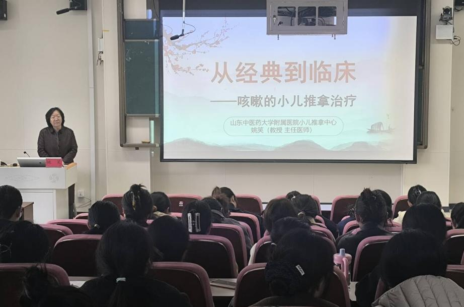 为传承中医经典理论,提升临床实践能力,近日,山东中医药大学附属医院小儿推拿中心主任、教授、主任医师姚笑应邀莅临山东现代学院医学院,开展题为“从经典到临床——咳嗽的小儿推拿治疗”的专题讲座。本次讲座内容详实、氛围热烈,成功搭建了中医儿科推拿学术交流的优质平台。